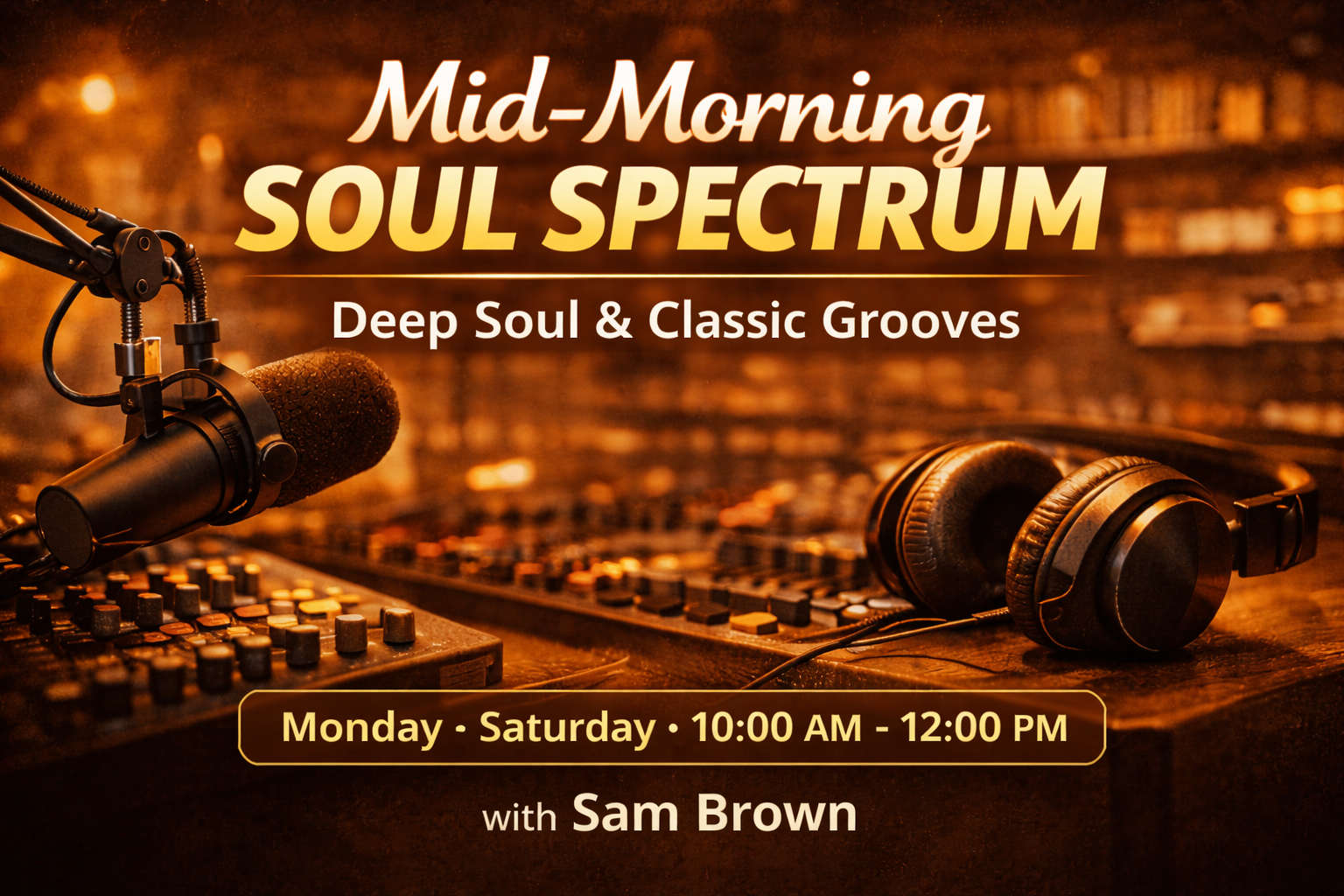 Sam Brown plays deep soul and classic grooves with timeless Soul Spectrum favourites, weekdays 10 AM–12 PM.